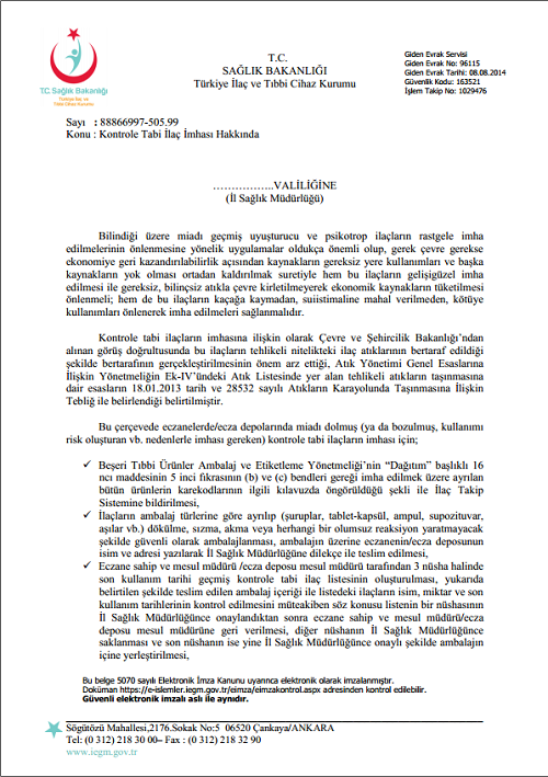 Kontrole tabi ilaçların imhasına ilişkin Sağlık Bakanlığı’nın 08.08.2014 tarihli ve 96115 sayılı yazısı aşağıdadır.