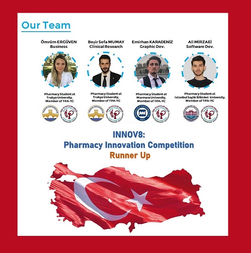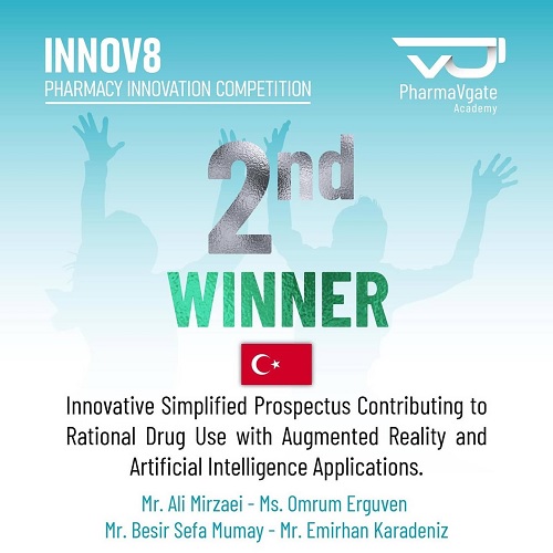 PharmaIno ekibi, IPSF (Uluslararası Eczacılık Öğrencileri Federasyonu) organizasyonuyla düzenlenen ve 70 ülkeden 200 projenin yarıştığı INNOV8’de, Innovative Simplified Prospectus Contributing to Rational Drug Use with Augmented Reality and Artificial Intelligence Applications (Arttırılmış Gerçeklik ve Yapay Zeka Uygulamalarıyla Akılcı İlaç Kullanımına Katkıda Bulunan Sadeleştirilmiş İnovatif Prospektüs) adlı projeyle ikincilik ödülü kazandı.