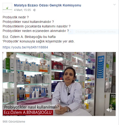 Televizyonlarda, radyoda ve sosyal ağlarda mesleğimizin dinamikleri yeteri kadar insanlara sunulmuyor. Sağlık bakanlığının bu doğrultuda olumlu çalışmaları olmakla birlikte kamu spotları ile yetinmemek gerektiği ve biz eczacılara da vazife düştüğü bir gerçektir. Bu bağlamda her hafta Malatya dahilindeki eczacılarımızla bizlere sağlıkta bilgilendirme amaçlı video kayıtları oluşturuyoruz. Ve bunları sosyal medyamızda paylaşıyoruz. Olumlu geri dönüşler aldık ve mümkün mertebe sağlıkla alakalı ve eczacının sorumlu olduğu her konuda yayınlarımıza devam edeceğiz.