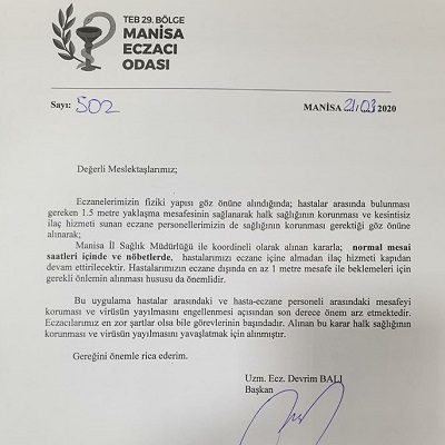 Manisa Eczacı Odası bir duyuru yayımlayarak; “Normal mesai saatleri içinde ve nöbetlerde, hastalarımızı eczane içine almadan ilaç hizmeti kapıdan devam ettirilecektir.” bilgisini verdi.