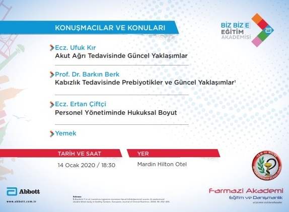 Abbott ve Farmazi Akademi’nin 14 Ocak 2020 Salı günü saat 18:30’da, Mardin Hilton Otel’de düzenlediği yemekli eğitim toplantısına davetlisiniz.