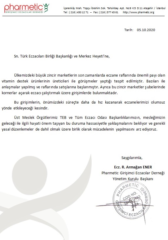 Pharmetic Girişimci Eczacılar Derneği Başkanı Ecz. R. Armağan Ener, TEB’ e yazdığı yazıda zincir marketlerin çalıştırmak üzere eczacı aradıklarını bildirdi.