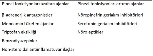 Pineal fonksiyonları stimüle veya inhibe ederek melatoninin plazma seviyelerini etkileyen farmakolojik ve nörokimyasal ajanlar: