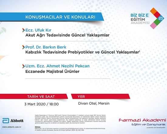 Abbott ve Farmazi Akademi’nin 3 Mart 2020 Salı günü saat 18:00’da, Divan Otel, Mersin’de düzenlediği yemekli eğitim toplantısına davetlisiniz.