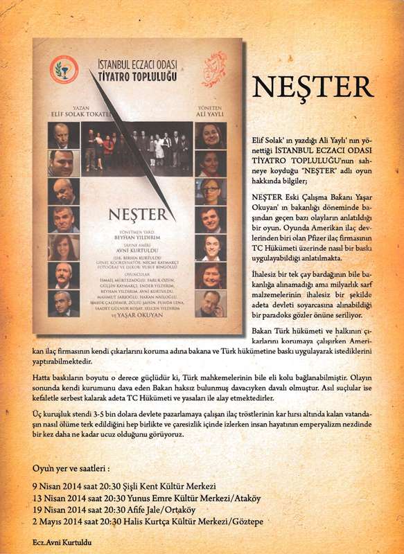 Elif Solak’ın yazdığı, Ali Yaylı’nın yönettiği, İstanbul Eczacı Odası Tiyatro Topluluğu’nun sahneye koyduğu "Neşter" adlı oyun, Eski Çalışma Bakanı Yaşar Okuyan’ın bakanlığı döneminde başından geçen olayların anlatıldığı bir oyun.
