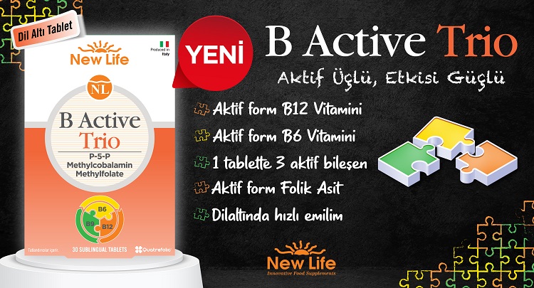 B Active Trio tek dil altı tablette P5P formunda B6 vitamini, metilkobalamin formunda B12 vitamini ve metilfolat formunda folik asit içermektedir.