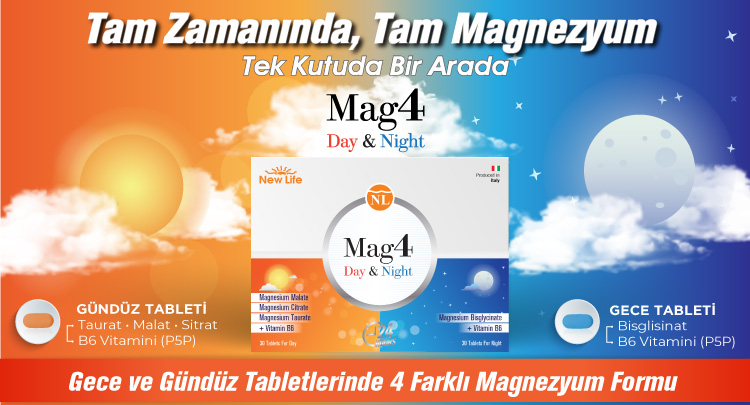 New Life Mag4 Day & Night; gece ve gündüze özel farklı renklerde ayrı tabletleri ile Sitrat-Malat-Taurat formlarını gündüz tabletinde; Bisglisinat formunu gece tabletinde olmak üzere 4 farklı formda Magnezyum, her iki tabletinde de aktif formda 5’er mg B6 vitamini içeren, yorgunluk-bitkinlik ve enerji metabolizmasının desteklenmesine katkıda bulunan bir magnezyum takviyesidir.