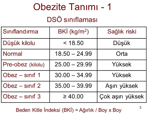 Obezitenin tanımında yaygın olarak kullanılan ölçüm yöntemi beden kitle indeksidir ve BKİ ya da VKİ olara kısaltılmıştır. BKİ, kilogram cinsinden ölçülen beden ağırlığının santimetre cinsinden ölçülen boyun karesine bölünmesi ile bulunur ve bu değerin 30 ve üzerinde olması obezite olarak kabul görür.
