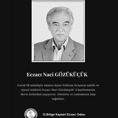 “Covid-19 sebebiyle odamız üyesi, Yıldırım Eczanesi sahip ve mesul müdürü Ecz. Naci Gözüküçük’ü kaybetmenin derin üzüntüsü içerisindeyiz. Ailesinin, sevenlerinin ve camiamızın başı sağolsun.”