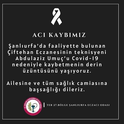 Eczane Teknisyeni Abdulaziz Umuç’ u (Çiftehan Eczanesi- Şanlıurfa) Covid- 19 nedeniyle kaybettik.