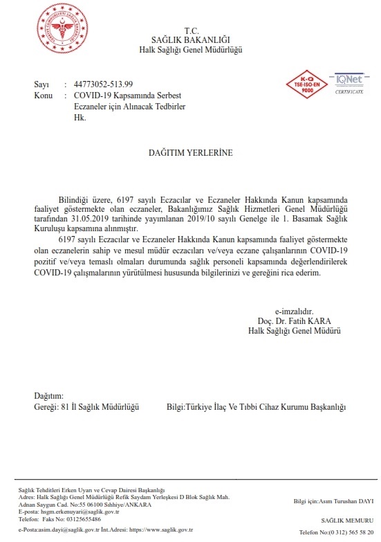 6197 sayılı Eczacılar ve Eczaneler Hakkında Kanun kapsamında faaliyet göstermekte olan eczanelerin sahip ve mesul müdür eczacıları ve/veya eczane çalışanlarının COVID-19 pozitif ve/veya temaslı olmaları durumunda sağlık personeli kapsamında değerlendirilerek COVID-19 çalışmalarının yürütülmesi hususunda bilgilerinizi ve gereğini rica ederim.