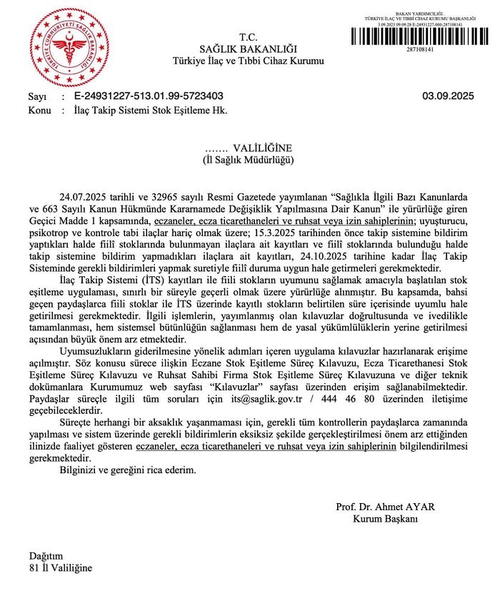 TİTCK tarafından "Eczane Stok Eşitleme Süreç Kılavuzu" yayımlandı, deaktivasyon için kullanılacak 75 kodu İTS portal'de aktive edildi.