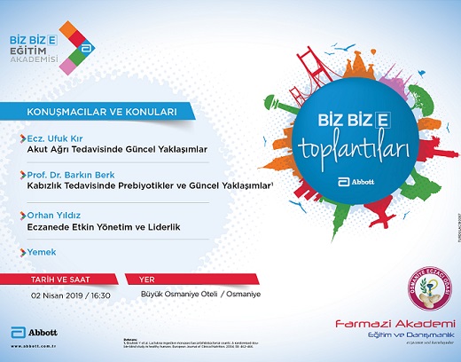 Abbott ve Farmazi Akademi’nin 2 Nisan 2019 Salı günü saat 16:30’da, Büyük Osmaniye Oteli- Osmaniye’de düzenlediği yemekli eğitim toplantısına davetlisiniz.