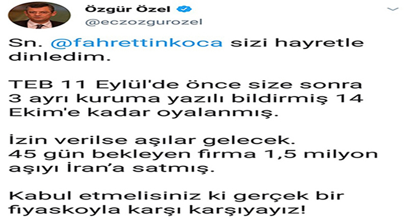“Sn. Fahrettin Koca sizi hayretle dinledim. TEB 11 Eylül’ de önce size sonra 3 ayrı kuruma yazılı olarak bildirmiş 14 Ekim’ e kadar oyalanmış. İzin verilse aşılar gelecek. 45 gün bekleyen firma 1.5 milyon aşıyı İran’ a satmış. Kabul etmelisiniz ki gerçek bir fiyaskoyla karşı karşıyayız”