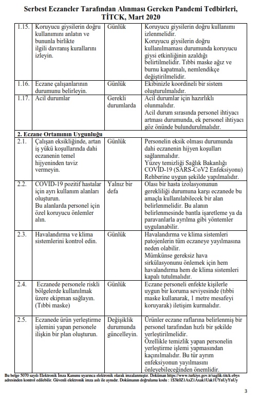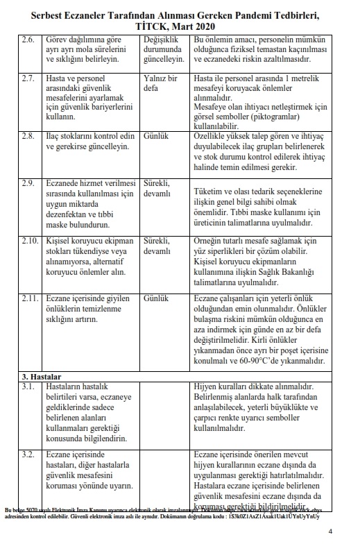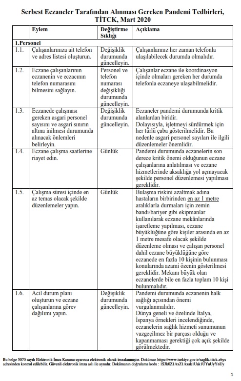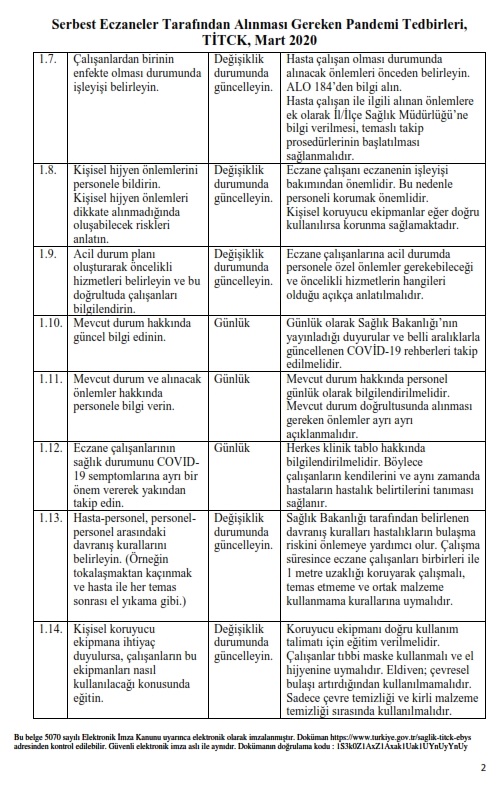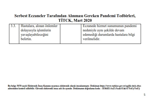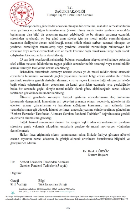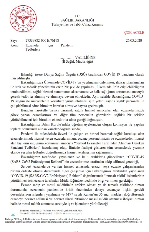 Covid-19 sürecinde, eczanelerimiz tarafından verilen sağlık hizmet sunumu ile ilgili olarak, Bilim Kurulunun 23.03.2020 tarihli toplantısında yaptığı değerlendirme sonrasında TİTCK Başkanlığı tarafından, serbest eczaneler tarafından alınması gereken pandemi tedbirlerine yönelik açıklamalar ekte yer almaktadır.
