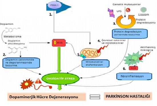 Parkinson tıpkı Alzheimer gibi oksidatif hasara (mitokondriyal kaynaklı) bağlı oluşmaktadır. Antioksidan aktivitenin bozulmasının yanı sıra tirozin hidroksilaz ve monoamin oksidaz gibi enzimlerin serbest radikal üretimi de artmaktadır. Mitokondriyal solunum zincirinin bozulmasında rol oynayan dopaminerjik nöron ölümüne neden olan başkahraman MPTP’ dir. ( 1-metil- 1,2,3,6- tetrahidropiridin) 1 metil 4 fenilpiridinyuma metabolize olur ve serbest radikal hasarı maksimuma çıkar.