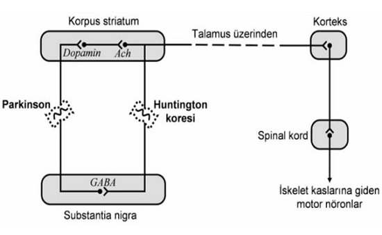 · Beyin kabuğu altında yer alan “substantia nigra” da (kara çekirdek) sinirler arası iletiyi sağlayan ve dopamin adı verilen maddeyi üreten sinir hücreleri hasara uğrar (dejenerasyon) ve yıllar içinde sayıları giderek azalır. Bu hücreler %80 oranında azaldığında hastalığın hareketleri kısıtlayıcı belirtileri ortaya çıkar.