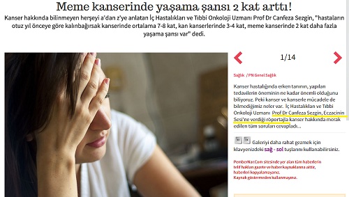 Kanser hakkında bilinmeyen herşeyi a’dan z’ye anlatan İç Hastalıkları ve Tıbbi Onkoloji Uzmanı Prof Dr Canfeza Sezgin, "hastaların otuz yıl önceye göre kalınbağırsak kanserinde ortalama 7-8 kat, kan kanserlerinde 3-4 kat, meme kanserinde 2 kat daha fazla yaşama şansı var" dedi.