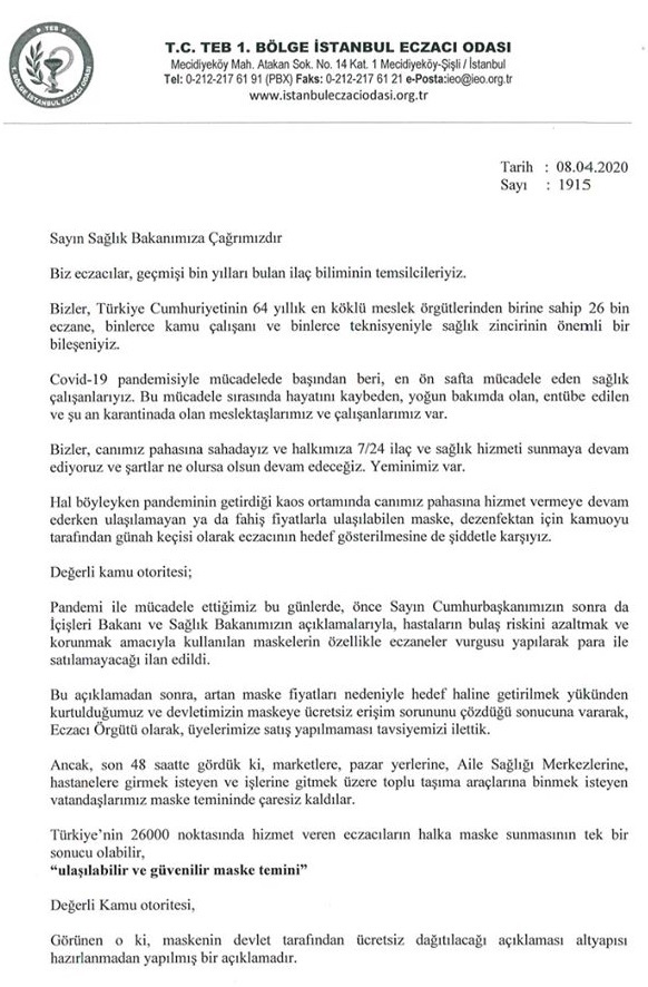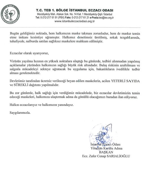 Bu zor günlerde, halk sağlığı için verdiğimiz mücadelede, biz eczacılar devletimizin temin edeceği maskeleri, halkımıza ulaştırmak adına da gönüllü olacağımızı buradan ilan ediyoruz.