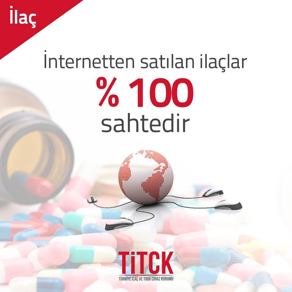 Sağlık Bakanlığı TİTCK, internetten satılan ilaçların % yüz sahte olduğunu bildiren bir afiş hazırlayarak kamuoyunun dikkatine sundu.