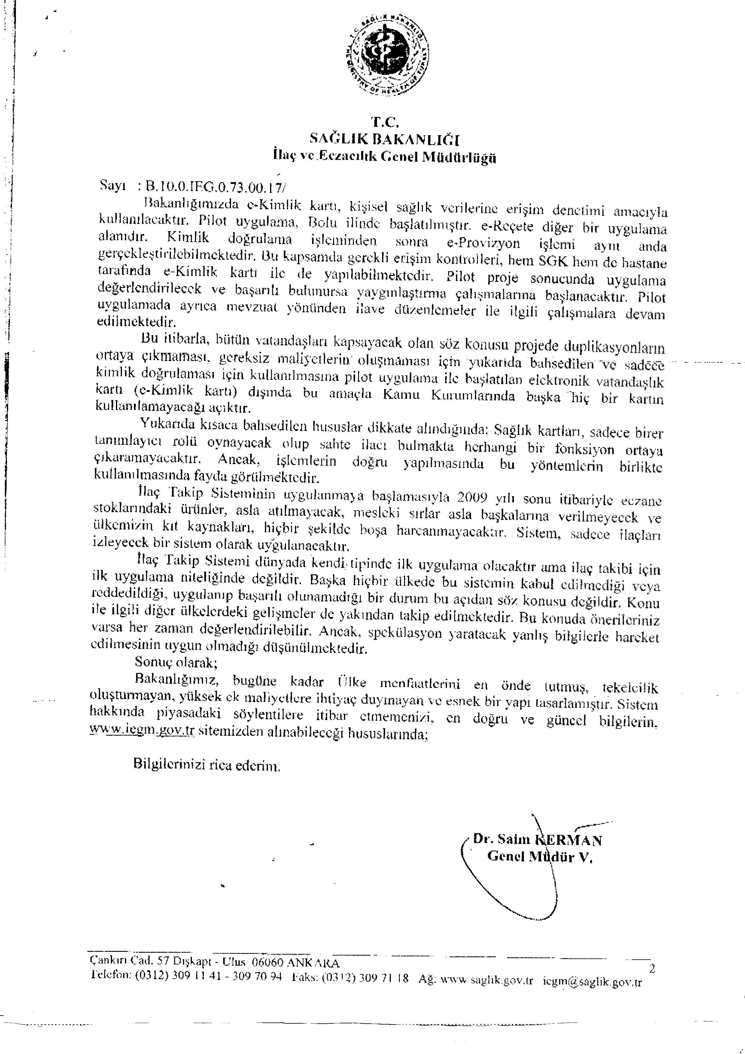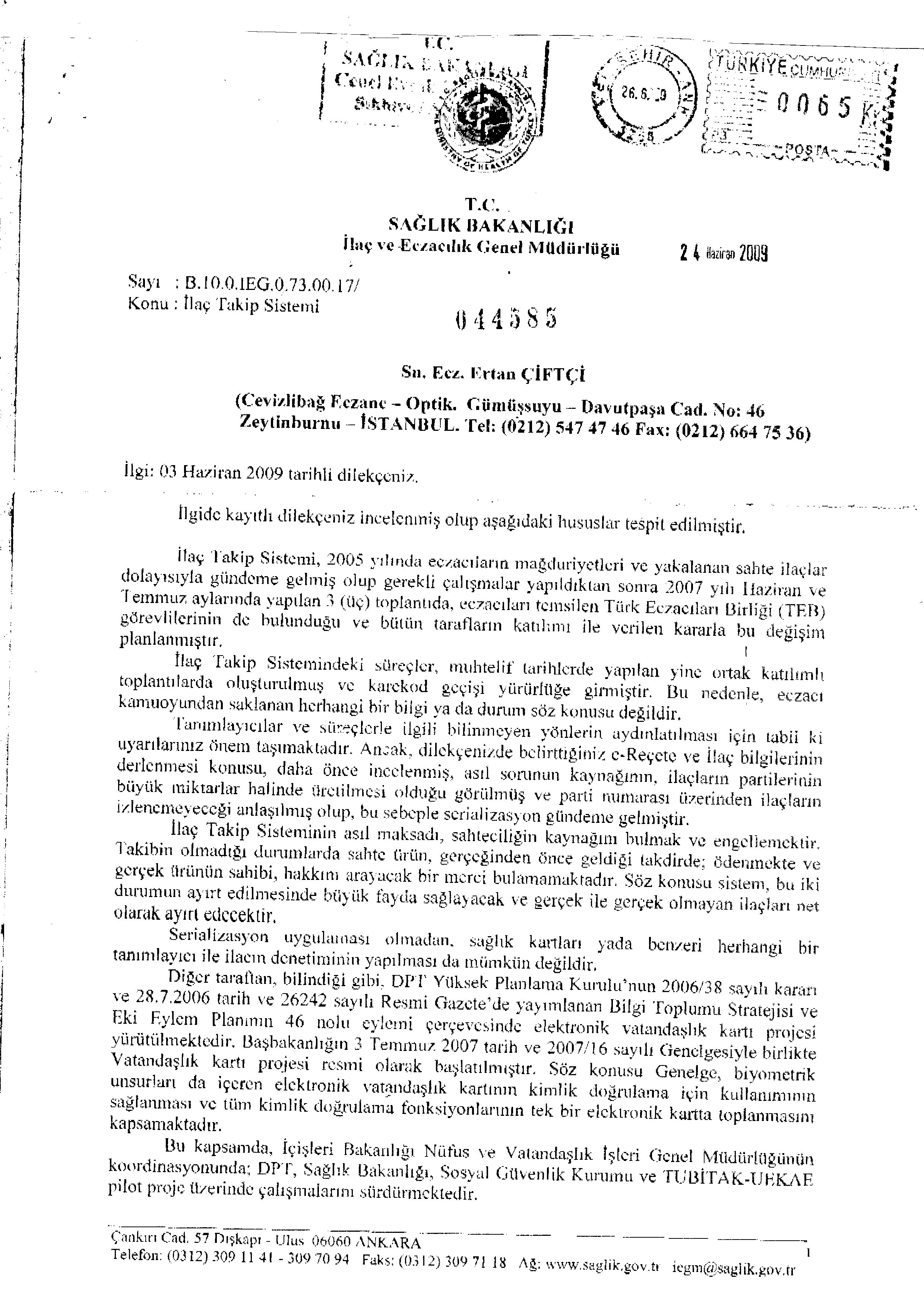 T.C. Sağlık Bakanlığı’na gönderilen yazıya 24.06.2009 tarih, 044585 sayı ve İlaç Eczacılık Genel Müdürlüğü Genel Müdür vekili Dr.Saim Kerman imzalı yanıt geldi.