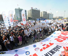 "Esnek ve güvencesiz çalışmaya hayır", "Sağlıkta ticarileş tirmeye sessiz kalmayacağız", "Performans sağlığa zararlıdır", "İlaç reklamı öldürür", "Devşirme hemşire istemiyoruz", "Holding değil tıp fakültesi", "Hekime şiddete son", "Doktorlar sözleşmeli, Vatandaşlar müşteri olmasın", "Hekim düşmanı sağlık bakanı", "Ciro baskısına son" ve "Tüccar de ğil hekimiz" dövizleri taşıyan sağlık çalışanları, çalışma şartlarının iyileştirilmesi taleplerini dile getiren sloganlar eşliğinde, kortejler halinde Sıhhiye Meydanı’na yürüdü.