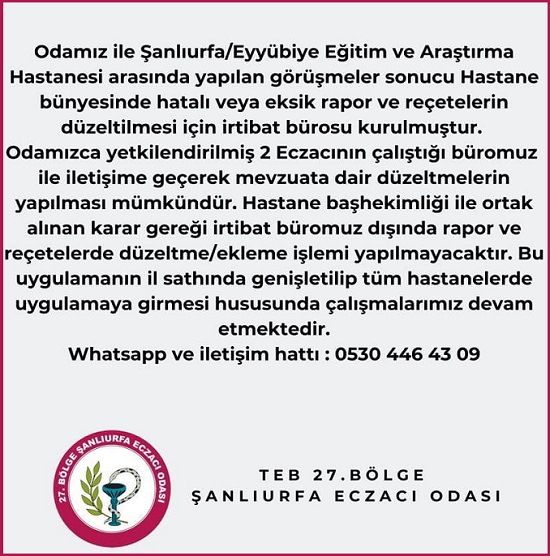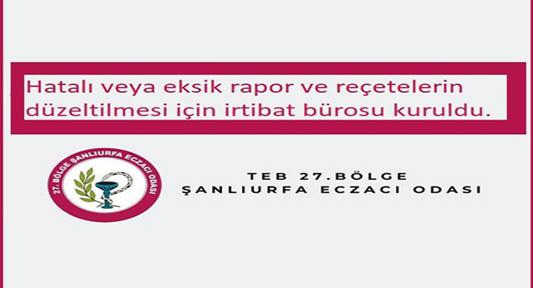 Şanlıurfa Eczacı Odası’ ndan rapor ve reçete düzeltme işlem bürosu.