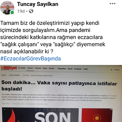 Gazetenin bu ifadesine İzmir Eczacı Odası Başkanı Ecz. Tuncay Sayılkan sosyal medya hesabından yaptığı bir paylaşımla itiraz etti.
