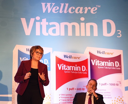 Wellcare Bölüm Müdürü İpek Özçırpıcı, toplantıda yaptığı konuşmasında; Türkiye’de ilk defa sprey formunda ve kılavuzlara uygun dozda üretilen Wellcare Vitamin D3’ün içeriğinde etken madde olarak yüzde 100 saf D3 vitamini (kolekalsiferol) ve çözücü olarak saf zeytinyağı ile farklılaştığını ifade etti. Özçırpıcı,“Wellcare Vitamin D3’ün en önemli farkı BHA, tatlandırıcı, katkı maddesi, şeker, alkol içermeyen bir gıda takviyesi olması.Wellcare Vitamin D3, Avrupa Endokrin Derneği Klinik Uygulama Kılavuzunda çocuk ve yetişkinler için önerilen dozlarda D3 vitamini içeriyor. Tavsiye edilen dozlarda kullanıldığında vücutta birikmiyor ve toksik etkilere neden olmuyor. Sprey şeklinde püskürtülerek uygulandığı için her püskürtmede güvenli miktarda D vitamini desteği sağlıyor. Çocuk ve yetişkinlerde önerilen 400 IU-600 IU-1000 IU doz seçeneklerine göre bir ya da iki kez püskürtülerek kullanım kolaylığı sağlıyor. Sprey formu sayesinde taşınması ve saklanması da oldukça pratik bir ürün. Bilindiği gibi D vitamini düzeyinin korunması sadece kemik, kalsiyum ve fosfor metabolizması için değil, aynı zamanda genel sağlık ve iyilik hali için de oldukça önemli” dedi.