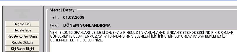 TEMMUZ DÖNEMİ FATURALARINA AİT TESLİM TARİHİ 22.08.08 TARİHİNE KADAR UZATILMIŞTIR.01.07.2008 TARİHİNDEN İTİBAREN GİRİLEN REÇETELERİN YENİ ECZANE İSKONTO ORANLARINA GÖRE DÜZELTME İŞLEMLERİ HERGÜN 18:00-08:00 SAATLERİ ARASINDA REÇETE İADE KISMINDAN DÜZELT-KAYDET BUTONLARI KULLANILARAK YAPILABİLECEKTİR...