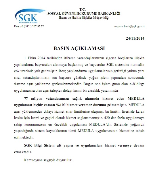 1 Ekim 2014 tarihinden itibaren vatandaşlarımızın sigorta borçlarına ilişkin yapılandırma başvuruları alınmaya başlanmış ve başvurular SGK sistemine normalin çok üzerinde yük getirmiştir. Borç yapılandırma uygulamalarının getirdiği yükün yanı sıra, vatandaşlarımızın son başvuru gününde yoğun işlem yapmaları sonucunda sisteme aşırı yüklenme gözlemlenmektedir. Bugün son işlem günü olan e-bildirge uygulamasına olan aşırı talepten dolayı kısmi bir aksaklık yaşanmıştır.