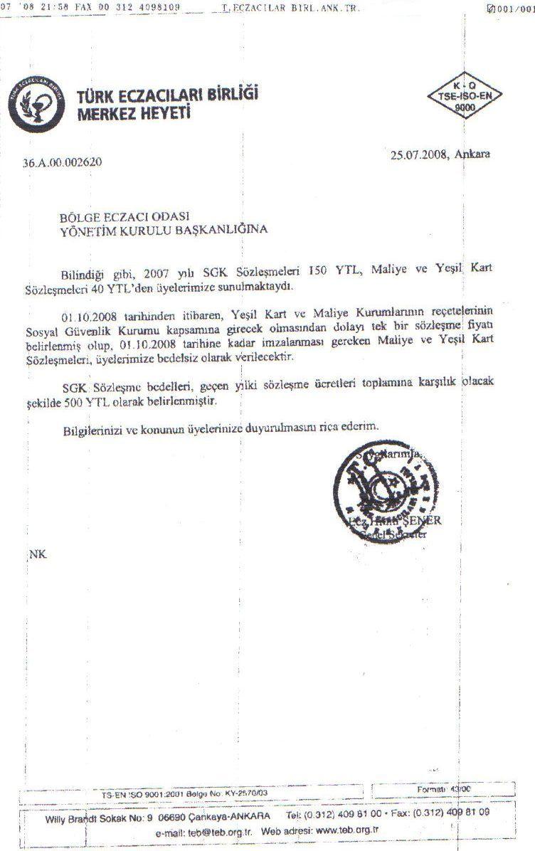 Türk Eczacıları Birliği, sözleşmelerin 01.08.2008 tarihine kadar yenilenerek SGK İl müdürlüklerine teslim işlemlerinin tamamlanmasını istedi.