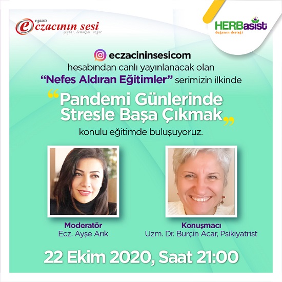 22 Ekim akşamı Herbasist sponsorluğunda Eczacının Sesi Instagram sayfasında gerçekleştirilecek olan Nefes Alan Eğitimler Serisi’nin ilki olan "Pandemi Günleri’nde Stresle Başa Çıkmak" konulu eğitime katılan eczacılarımız arasından Herbasisttr ve Kadınların Emeği instagram sayfalarını takip eden 5 kişiye Herbasist’in desteklediği Kadınların Emeği projesinde yer alan kadınlarımızın ürünlerinden hediye ediyoruz.