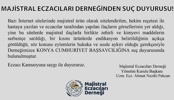 Majistral Eczacıları Derneği, Konya Cumhuriyet Başsavcılığına suç duyurusunda bulundu.
