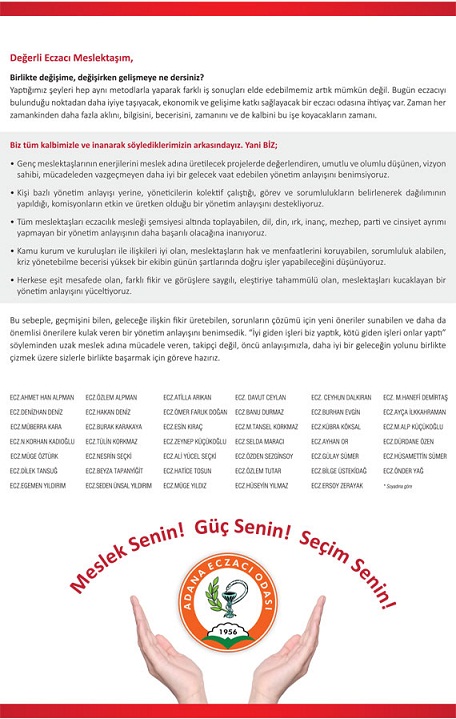 TEB Başkanı Ecz. Erdoğan Çolak’ın bağlı olduğu Adana Eczacı Odası’nda şimdilik iki liste seçime hazırlanıyor.