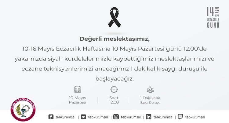 “10- 16 Mayıs Eczacılık Haftasına 10 Mayıs Pazartesi günü 12 00 de yakamızda siyah kurdelelerimizle kaybettiğimiz meslektaşlarımızı ve eczane teknisyenlerimizi anacağımız 1 dakikalık saygı duruşu ile başlayacağız.”