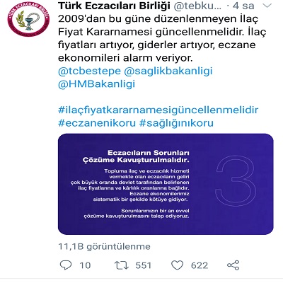 TEB’ in Twitter paylaşımı 551 kez retweenlendi. 622 like yapılan paylaşıma 10 yorum geldi. Yapılan paylaşıma eczacılardan geniş bir destek gelmediği gözlendi.