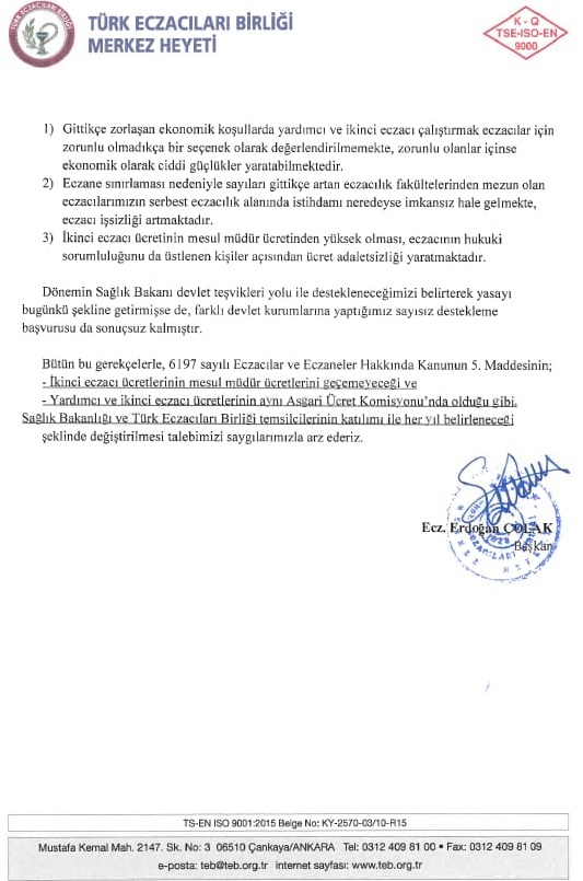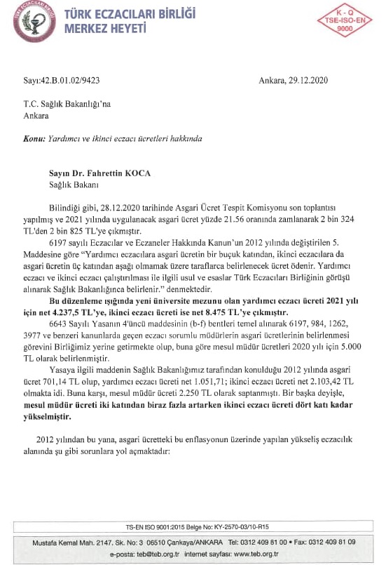 Türk Eczacıları Birliği (TEB), Sağlık Bakanı Fahrettin Koca’ ya bir yazı yazarak yardımcı ve ikinci eczacıların aylık ücretlerini, her yıl birlikte yeniden belirlemeyi önerdi ve talep etti.