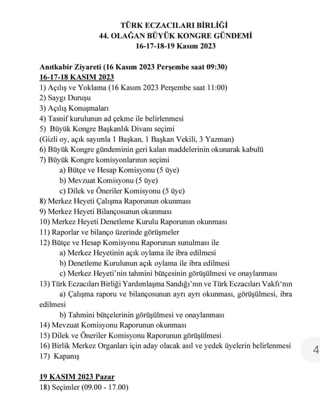 Türk Eczacıları Birliği (TEB) Seçimli Büyük Kongresi, JW Marriott Hotel Ankara’ da 16-17-18-19 Kasım 2023 tarihinde yapılacak.TEB Seçimli Büyük Kongresi gündemi şu şekilde: