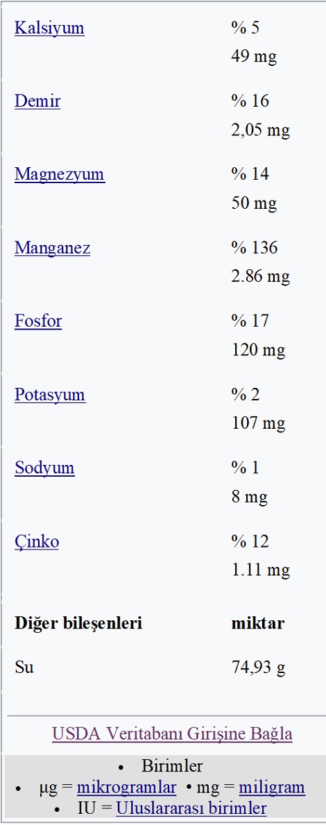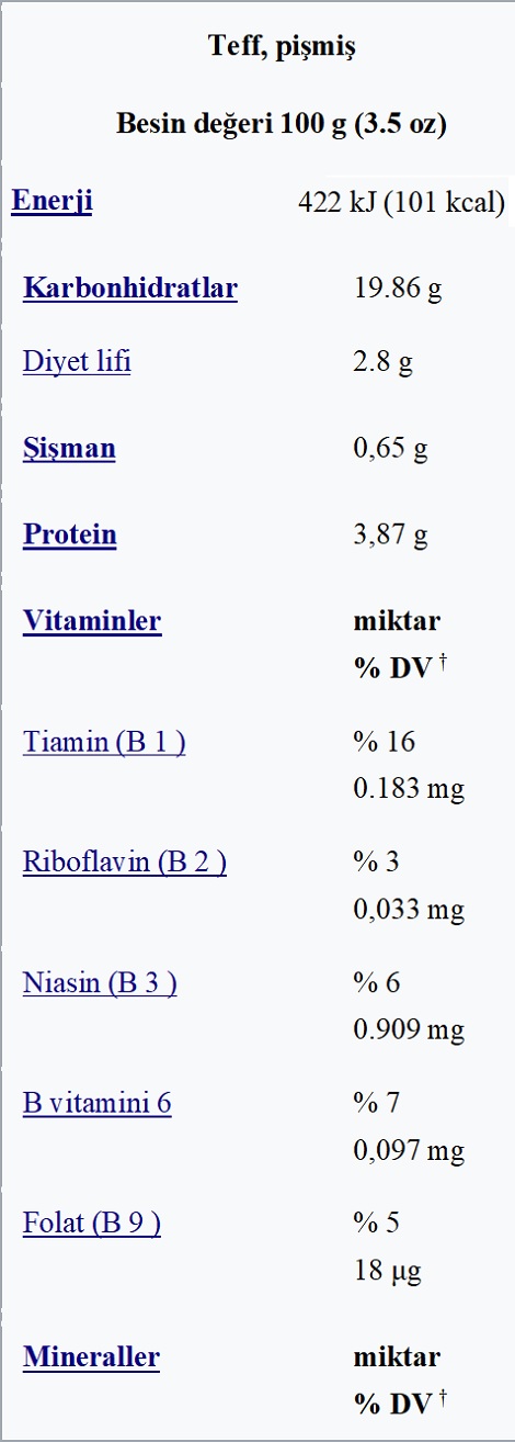 ETKEN MADDESİ: Pişirilmiş teff% 75 su,% 20 karbonhidrat ,% 4 protein ve% 1’den az yağdır (tablo). 100 gramlık bir miktarda pişirilmiş teff, 101 Kalori sağlar , zengin bir manganez kaynağıdır ve orta derecede tiyamin , fosfor , demir , magnezyum ve çinko içerir .