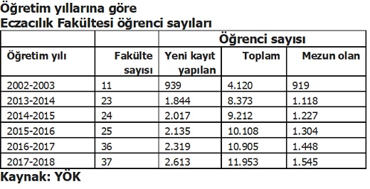Eczacılık fakülte sayısı 2003-2004 öğretim yılında 11 iken, şimdi aktif olarak 37eczacılık fakültesi var öğrenci alımı yapıyor. Eczacılık fakültesinde okuyan öğrenci sayısının 2023’de 9 bini aşacağı öngörülürken, bu durum mezun olanların işsizlik problemi ile karşı karşıya kalmasına neden olacak.