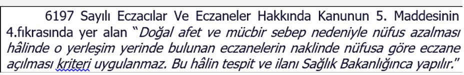 6 Şubat’ta meydana gelen deprem felaketinden etkilenen illerde sayıları beş bini bulan ve ülkemizdeki eczanelerin yaklaşık altıda biri kadar olan eczanemiz deprem nedeniyle oluşan ciddi nüfus azalması ve yıkımlardan dolayı eczanelerinde hizmet veremez duruma geldiler. Bölgedeki eczacılar, eczanelerini nakil edebilmek adına, nüfusa göre eczane açma kriterleri uygulanmaksızın nakil haklarının kendilerine tanımlanması için CİMER’e başvuruda bulunuyorlar; ancak bir sonuç alamıyorlar.