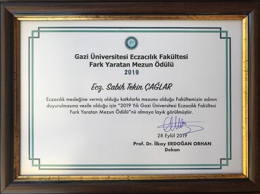 “Bir gün telefonumda kayıtlı olmayan bir numaradan arandım, Gazi Üniversitesi Eczacılık Fakültesi Dekanı Sayın İlkay Orhan’ın benimle görüşmek istediğini söylediler. Sayın dekanı yakinen tanımama rağmen hiç telefon ile görüşmüşlüğümüz yoktu. Merak ettim konuyu. İlkay Hocam ile yaptığım telefon görüşmesi bittikten sonra uzun süre sabit bir noktaya bakakaldım. Öğrencilik hayatımın en güzel yıllarımı geçirdiğim okulumun yönetimi beni fark yaratan mezun ödülüne layık görmüştü. Açıkçası şaşırmış, duygulanmış heyecanlanıştım. Azalır zannetmiştim ama yanılmışım. Bugün heyecanım artmış ve duygularım çok daha yoğun bir halde sizlerin huzurundayım…”