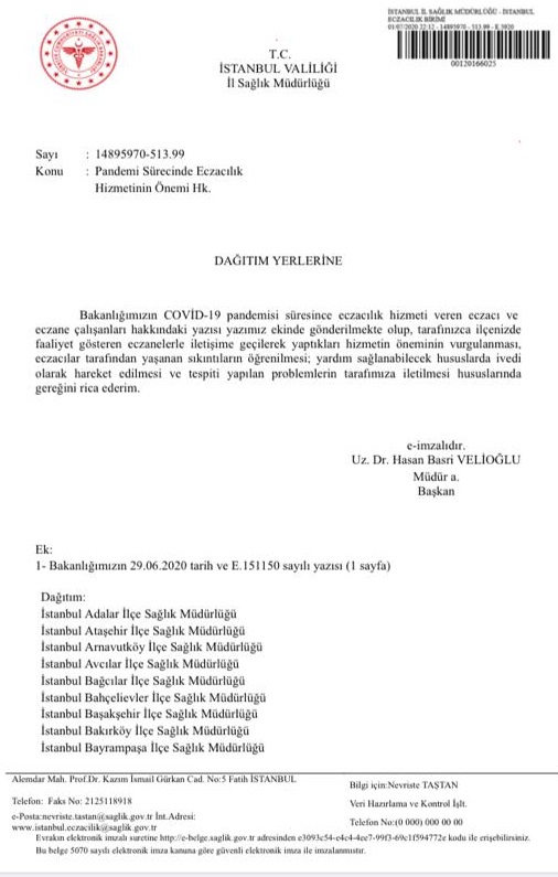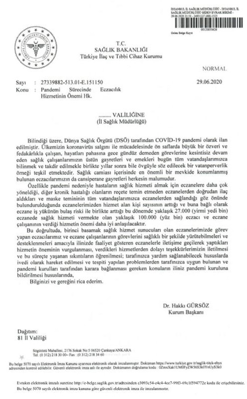 Türkiye İlaç Ve Tıbbi Cihaz Kurumu (TİTCK) Başkanı Dr. Hakkı Gürsöz, İl Valiliklerine gönderdiği yazıda, pandemide gösterdikleri başarılı çalışmalar için eczacılara ve eczane çalışanlarına hem teşekkür edilmesini hem de yaşadıkları sıkıntıların öğrenilerek, müdahale edilmesini istedi.