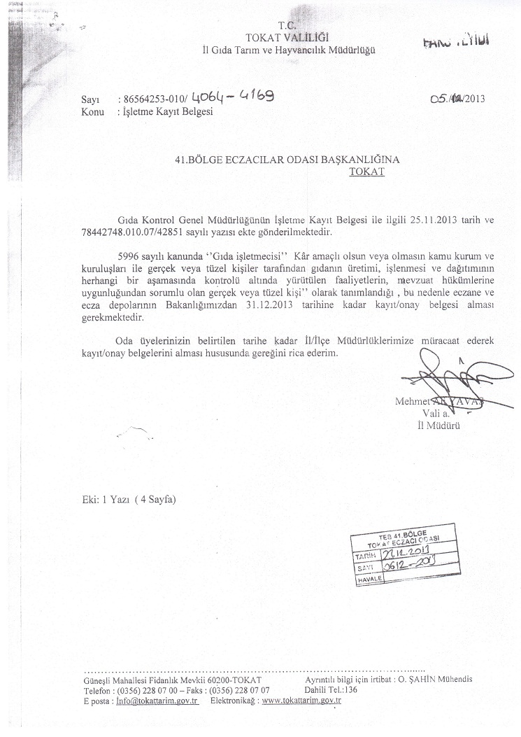 Tokat Eczacı Odası, kendilerine gönderilen yazıyı ve kayıt formunu yayınladı. Yazıda eczacıların 31 Aralık 2013 tarihine kadar kayıt yaptırmaları isteniyor.