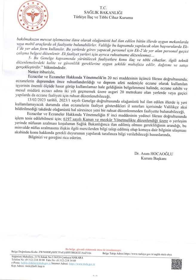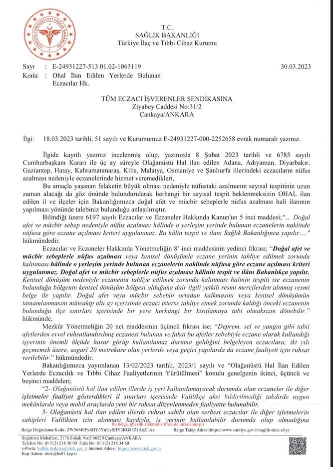 TİTCK, TEİS' in Olağanüstü Hal Bölgesi' nde, mağdur olmuş eczacılara ilişkin yazdığı yazıya yanıt verdi. TİTCK, yazısında mevzuatın uygulanacağını bildirdi.
