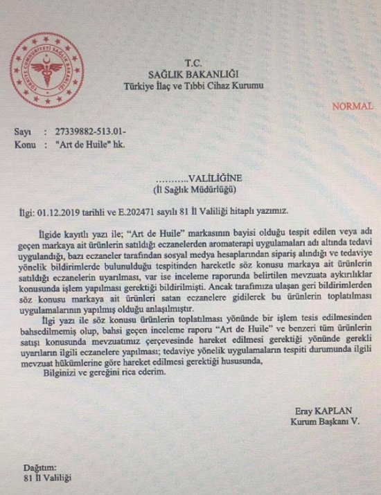 Art de Huile ve marka sahibi Ecz. Hülya Kayhan Eryılmaz’ la ilgili Sağlık Bakanlığı TİTCK bir yazı yayımlamıştı. TİTCK bir yazı daha yayımlayarak söz konusu ürünlere ilişkin bir toplatmadan söz etmediklerini, bazı bölgelerde bu ürünlerin toplatıldığını, bu uygulamanın yanlış olduğunu bildirdi.