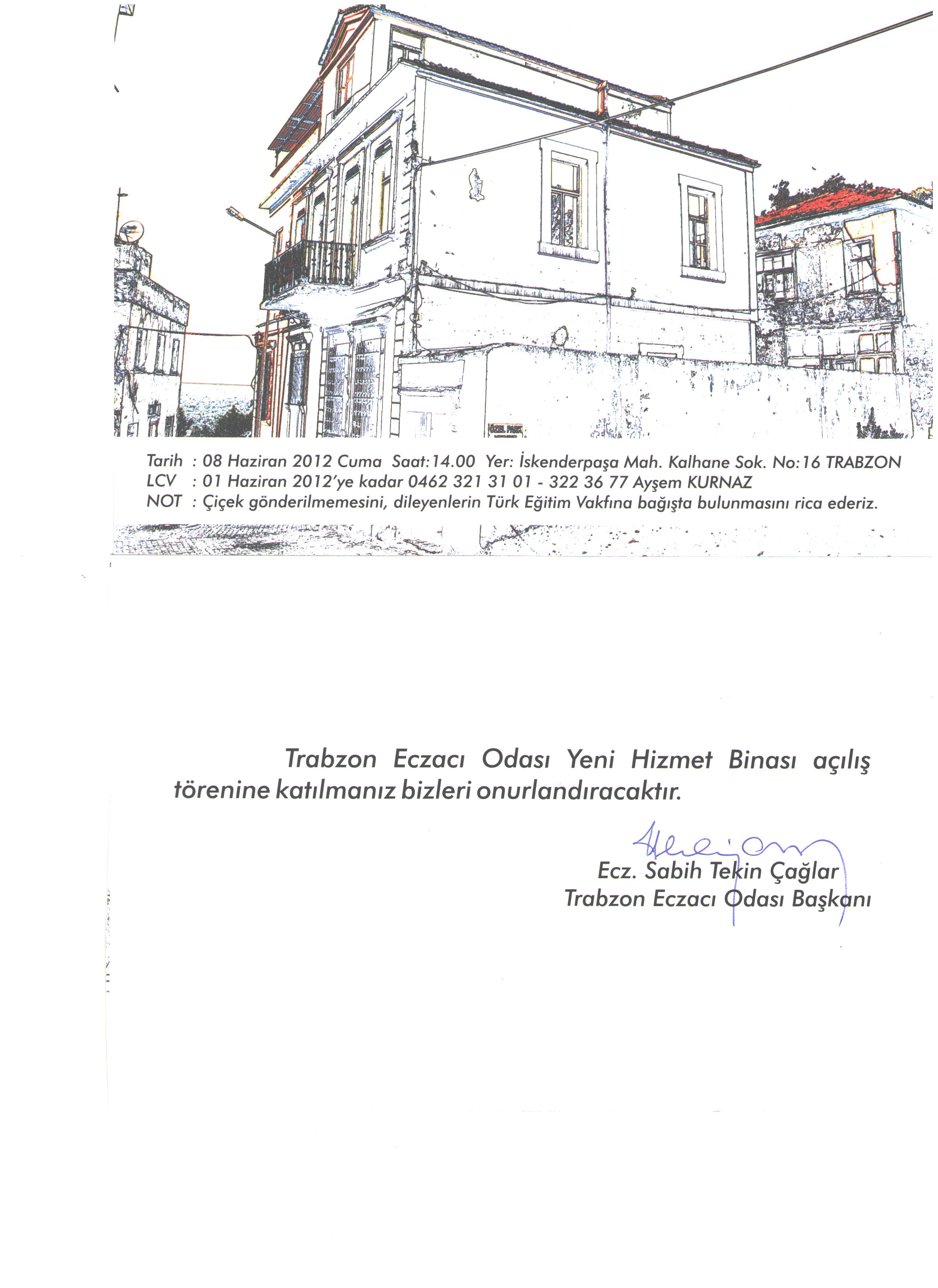 Trabzon Eczacı Odası yeni hizmet binasını 8 Haziran- Cuma günü saat 14: 00 de törenle açacak.