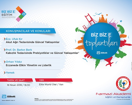Abbott ve Farmazi Akademi’nin 16 Nisan 2019 Salı günü saat 16:30’da, Elit World Oteli- Van’da düzenlediği yemekli eğitim toplantısına davetlisiniz.