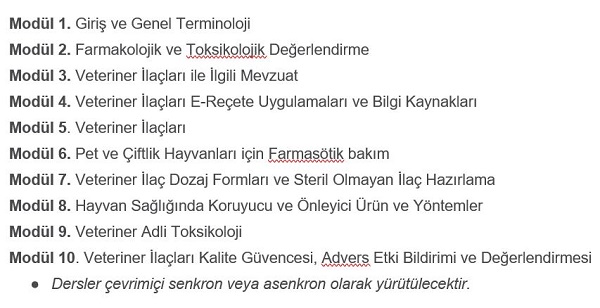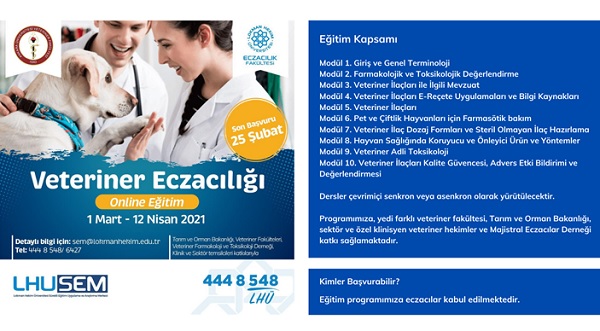 Lokman Hekim Üniversitesi Eczacılık Fakültesi ile Ankara Üniversitesi Veteriner Fakültesi işbirliği ve Tarım ve Orman Bakanlığı Gıda ve Kontrol Genel Müdürlüğü, Veteriner Fakülteleri, Majistral Eczacıları Derneği, Veteriner Farmakoloji ve Toksikoloji Derneği, klinik ve sektör temsilcilerinin katkıları ile ‘veteriner ilaçlarının doğru ve güvenli kullanımı, veteriner dozaj formları ve majistral ilaç hazırlanması, hayvan sağlığında kullanılan koruyucu ve önleyici ürün ve yöntemler, tıbbi destek ürünleri ve cihazları, veteriner ilaçlarda advers etki bildirimi ve mevzuat’ konuları başta olmak üzere eczacıların bilgi birikimini arttırmak ve veteriner hekimler ile işbirliklerini güçlendirmek adına ortak bir dil kullanmalarını sağlayabilmek için ‘Veteriner Eczacılığı Eğitim Programı’ düzenlenmektedir. Eğitim programı, 10 modül ve yaklaşık 70 saat dersten oluşacak şekilde tasarlanmıştır.